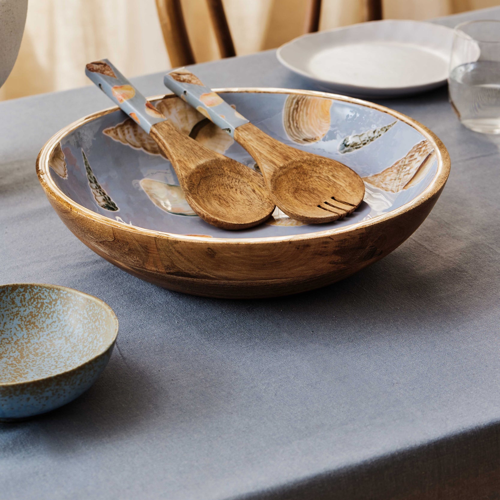 Hand-painted shell design printed on enamel with mango wood base, designed in-house in Melbourne.